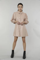 Our Faux Leather Dress with Puff Sleeves is your ticket to classic sophistication with a touch of edgy casual. Made from lightweight vegan leather, this tunic features three-quarter puff sleeves, a button-up front, and a classic collar. Paired with tights and a lightweight cardigan or jacket, this faux leather dress is ideal for the fall season, offering some warmth as well as a stylish, edgy appeal. Get ready to make a fashion statement with this comfortable and unique piece.