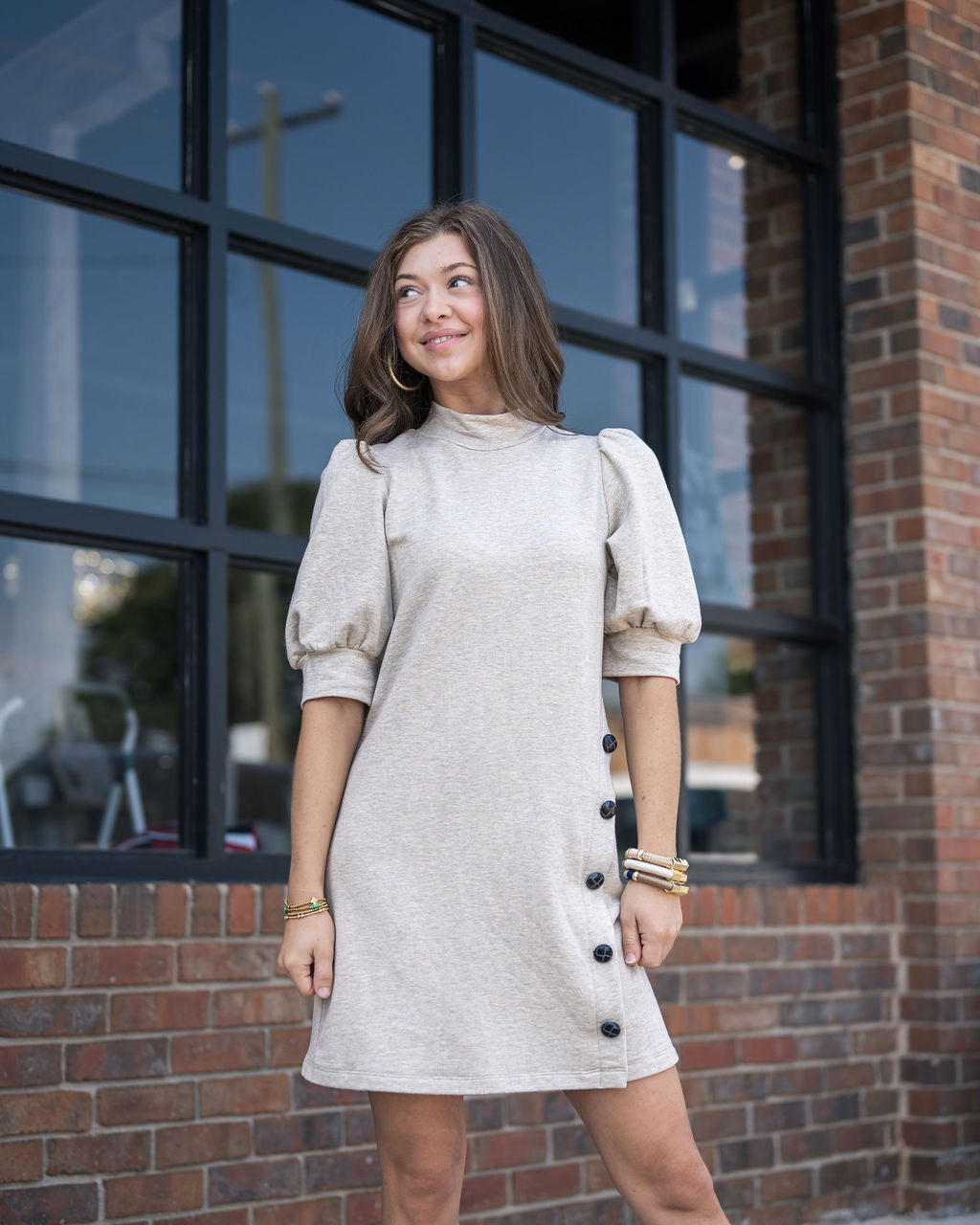 Indulge in comfort with the Elsie Dress. Made from soft fleece knit material, it offers a luxurious feel and a flattering fit that highlights your figure. The non-functional side button detail adds a touch of trendy sophistication to this versatile dress, perfect for any occasion.