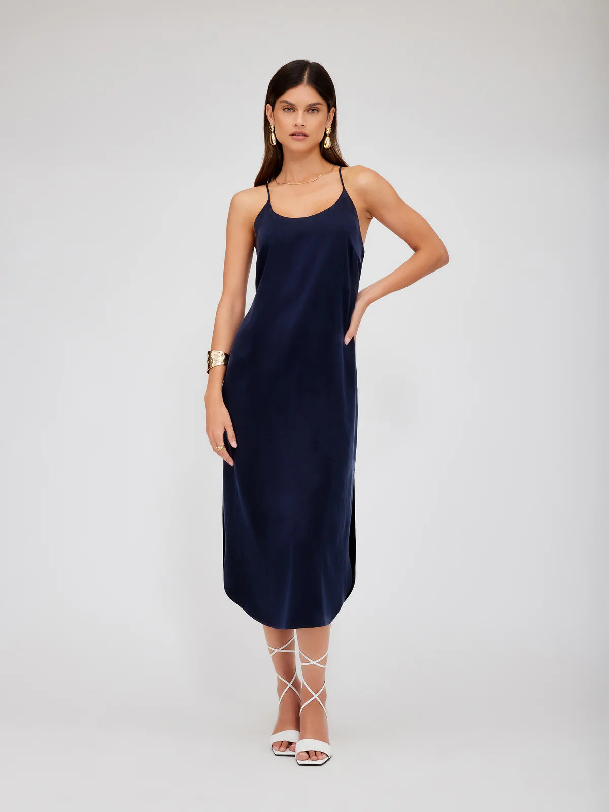 Fusing both flair and luxury, this dress is a harmonious blend of cupro woven and viscose fabric ensuring a luxurious feel against your skin. The midi length offers a timeless silhouette, while the racerback design adds a contemporary edge, making this dress a standout choice for anyone craving both sophistication and bold style.