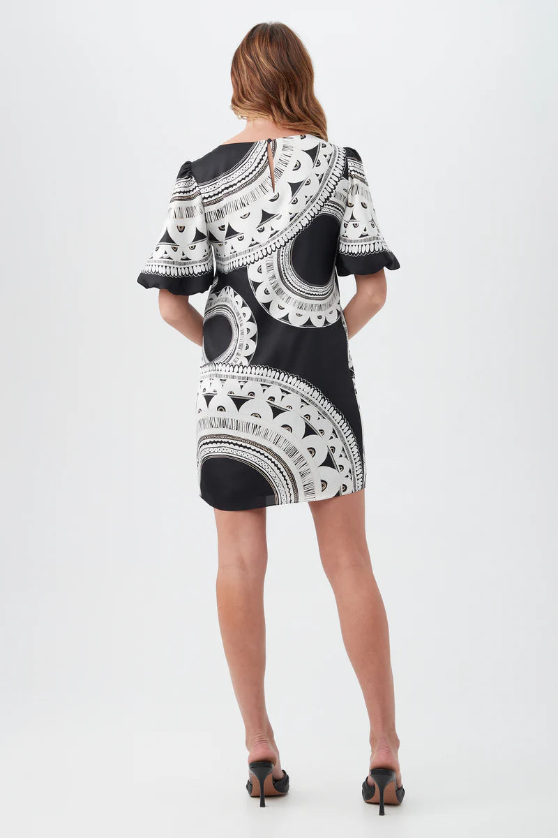 Exude understated elegance with this short sleeve dress, featuring a bold, black-and-white pattern, a slight boatneck neckline, and short, elbow-length puff sleeves. Perfect for any occasion, this patterned short-sleeve mini dress blends classic style with modern details for a sophisticated look.