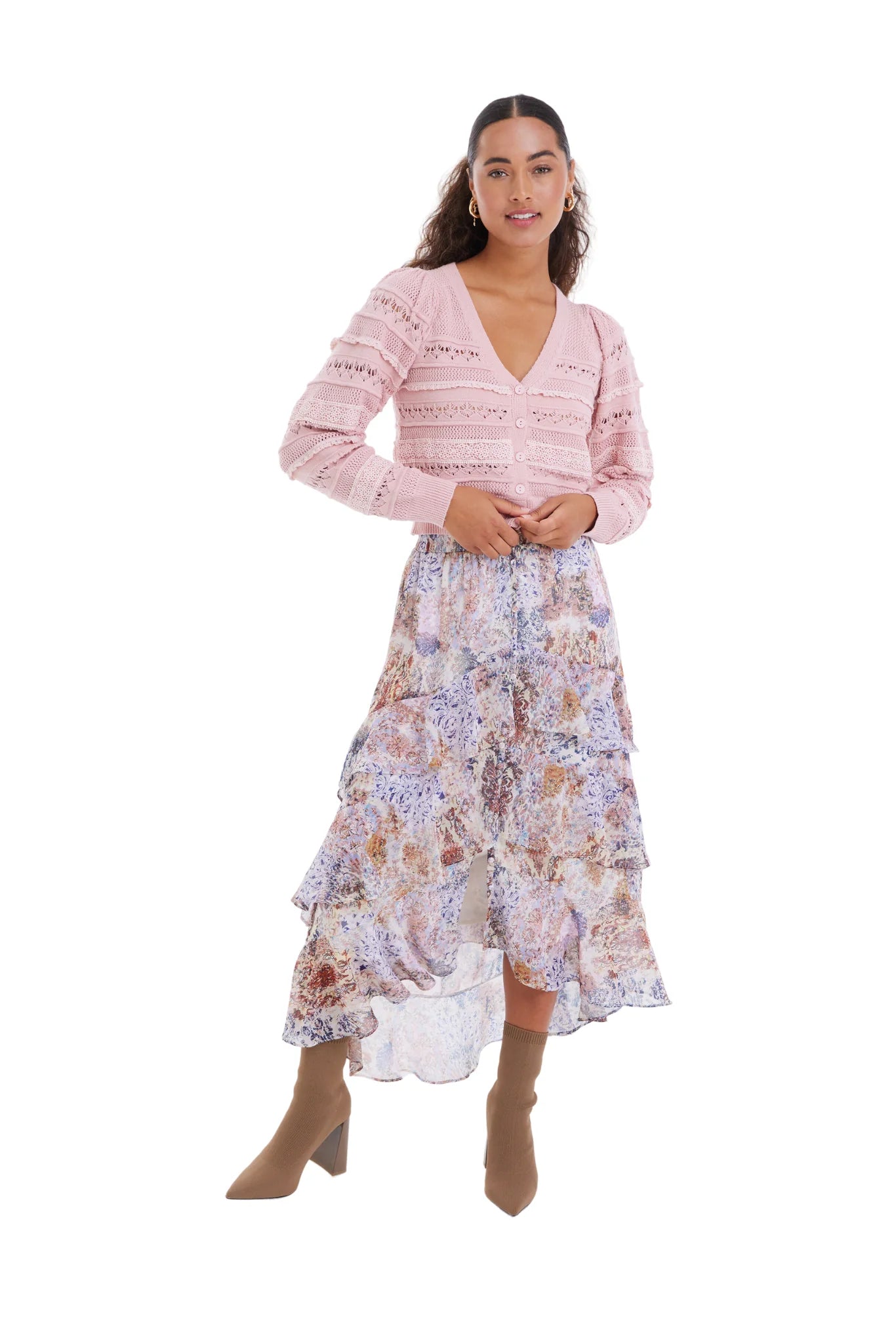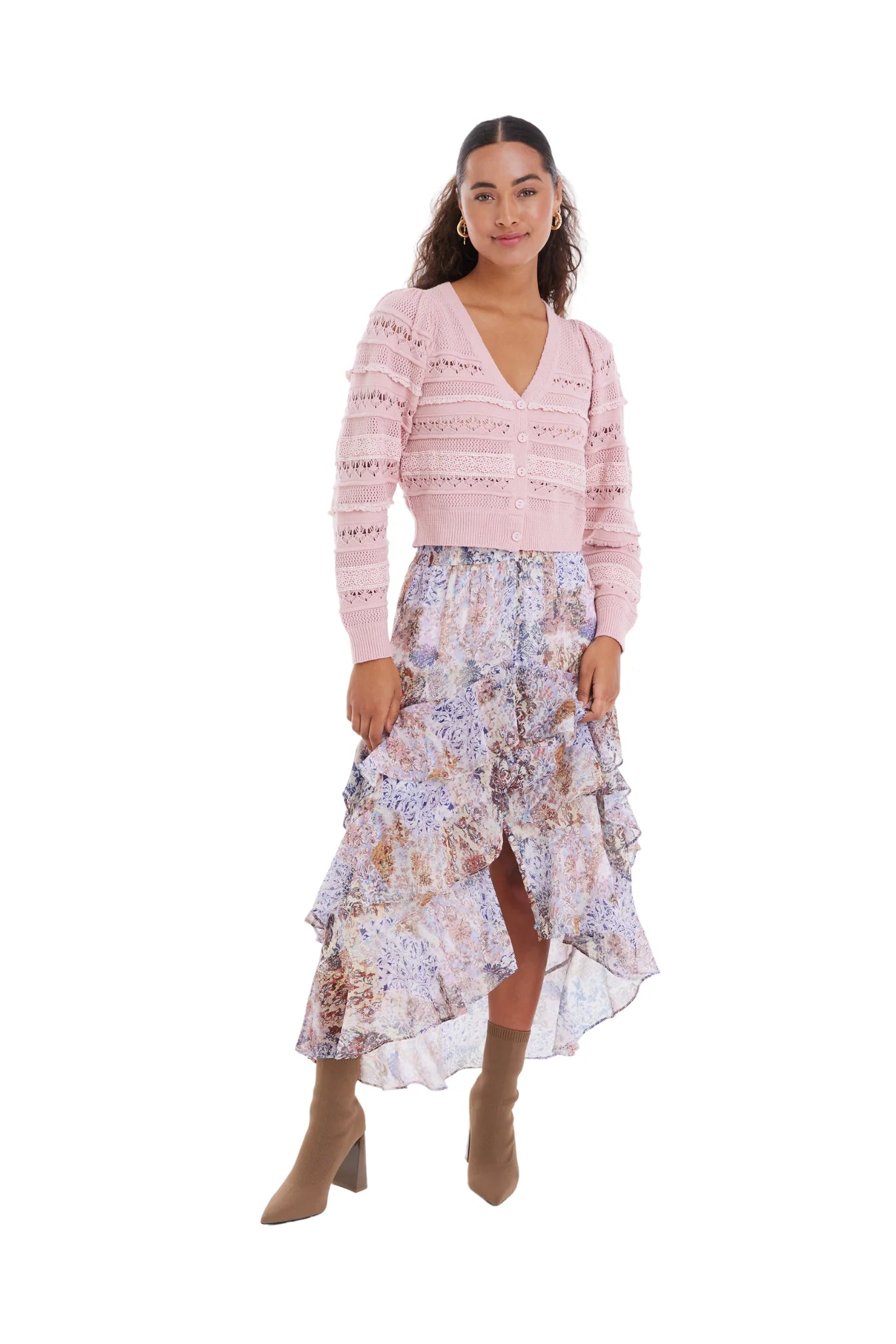 Our best selling Levy Cardi is back this season in a new soft blush colorway. Designed in a light-weight viscose yarn with rows of delicate crochet throughout. Cut in a V neck with buttons down the center front. Slightly cropped in length; The Levy pairs perfectly with your favorite ALLISON skirt or denim.