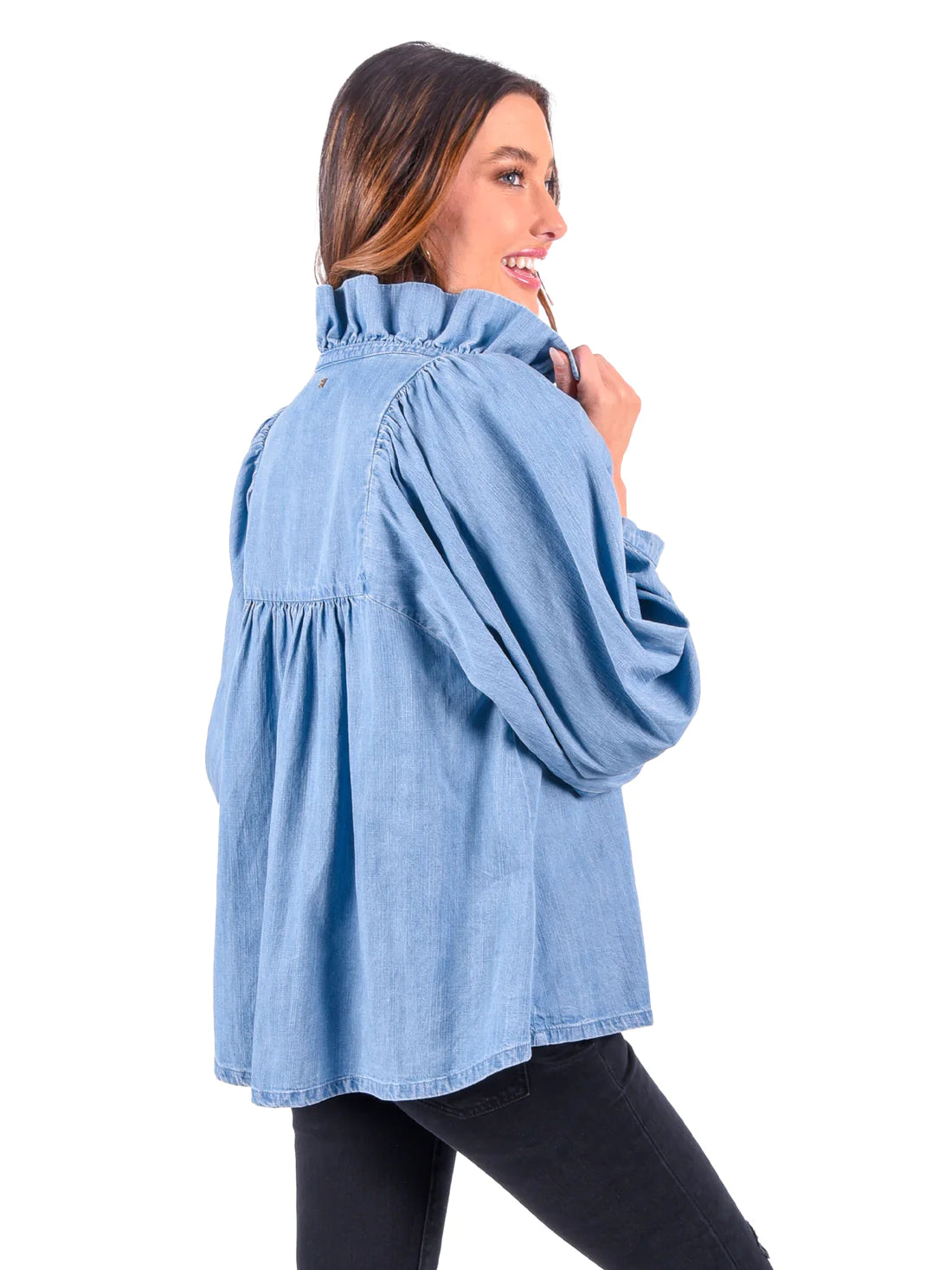 The Stella Top, in Denim Chambray, exudes both comfort and style. The signature high ruffled collar adds sophistication that pairs well with statement earrings and chunky necklaces for an elevated look. The effortless relaxed style is complimentary to every body type and is sure to become your favorite Emily McCarthy Collection style.