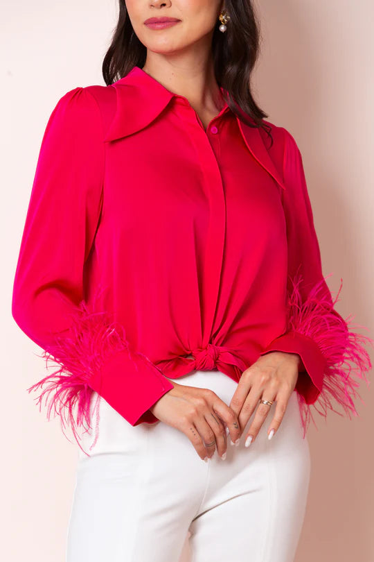 JESSIE LIU Silk Blouse with Feather Cuffs - Fuchsia