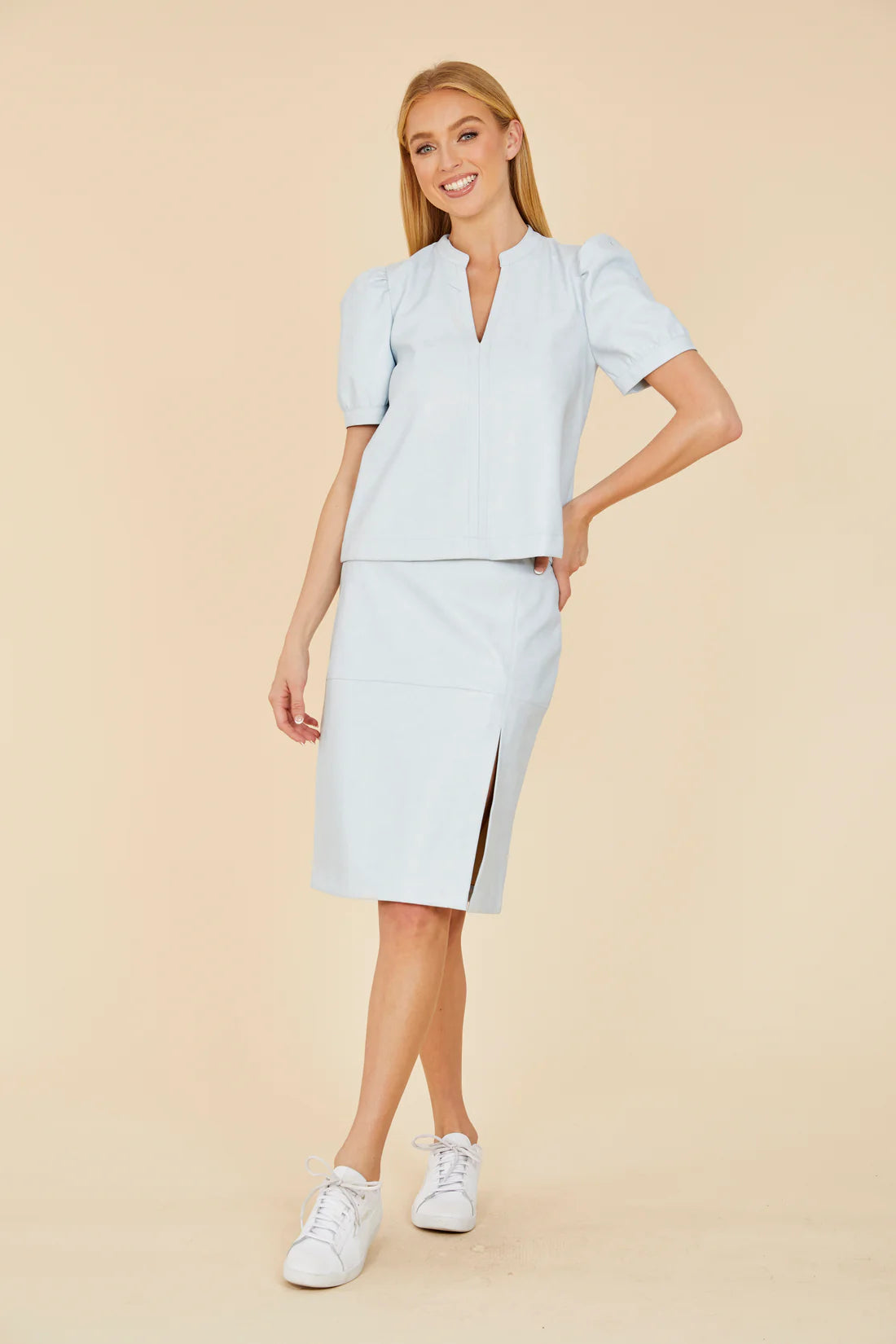 DOLCE CABO Vegan Leather Puff Sleeve Top- Sky Blue