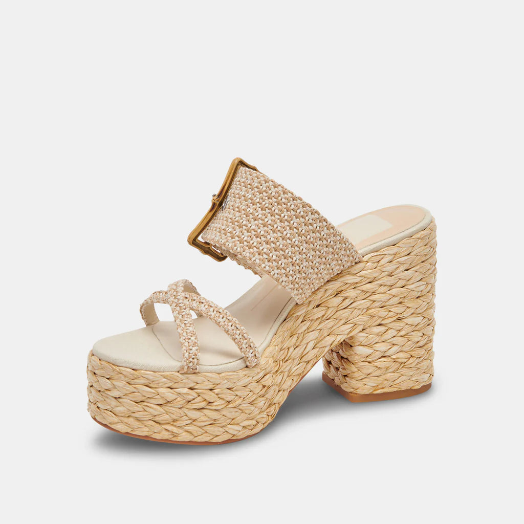 Chunky details and our favorite: raffia. EDWINA is covered in braided texture and finished off with a bamboo buckle for maximum tropical vibes.