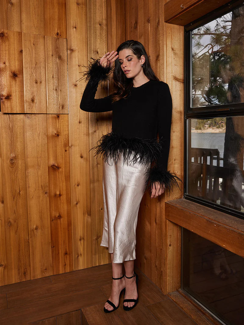 Dive into the world of high-end fashion with Camari - a striking blend of modern sophistication and delicate details. This straight-fit, long sleeve crewneck boasts an extraordinary touch of elegance with delicate feather trims that grace the neckline and cuffs. Crafted with meticulous attention to detail, Camari seamlessly combines comfort and style, making it a versatile addition to your wardrobe. Elevate your everyday look with a touch of luxury, and let Camari redefine your fashion statement with its unique feathered charm.