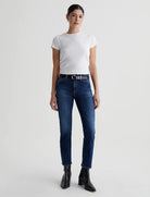 Our Mari Crop is a high-rise slim straight jean that's cropped just above the ankle. The high-waist silhouette fits easy around the hips with a straight leg and slim leg opening. It's featured in 10 oz. Empower Denim with superstretch construction and a dark blue wash that's been faded for a lived-in character. Marigold topstitching accents the classic five-pocket design.