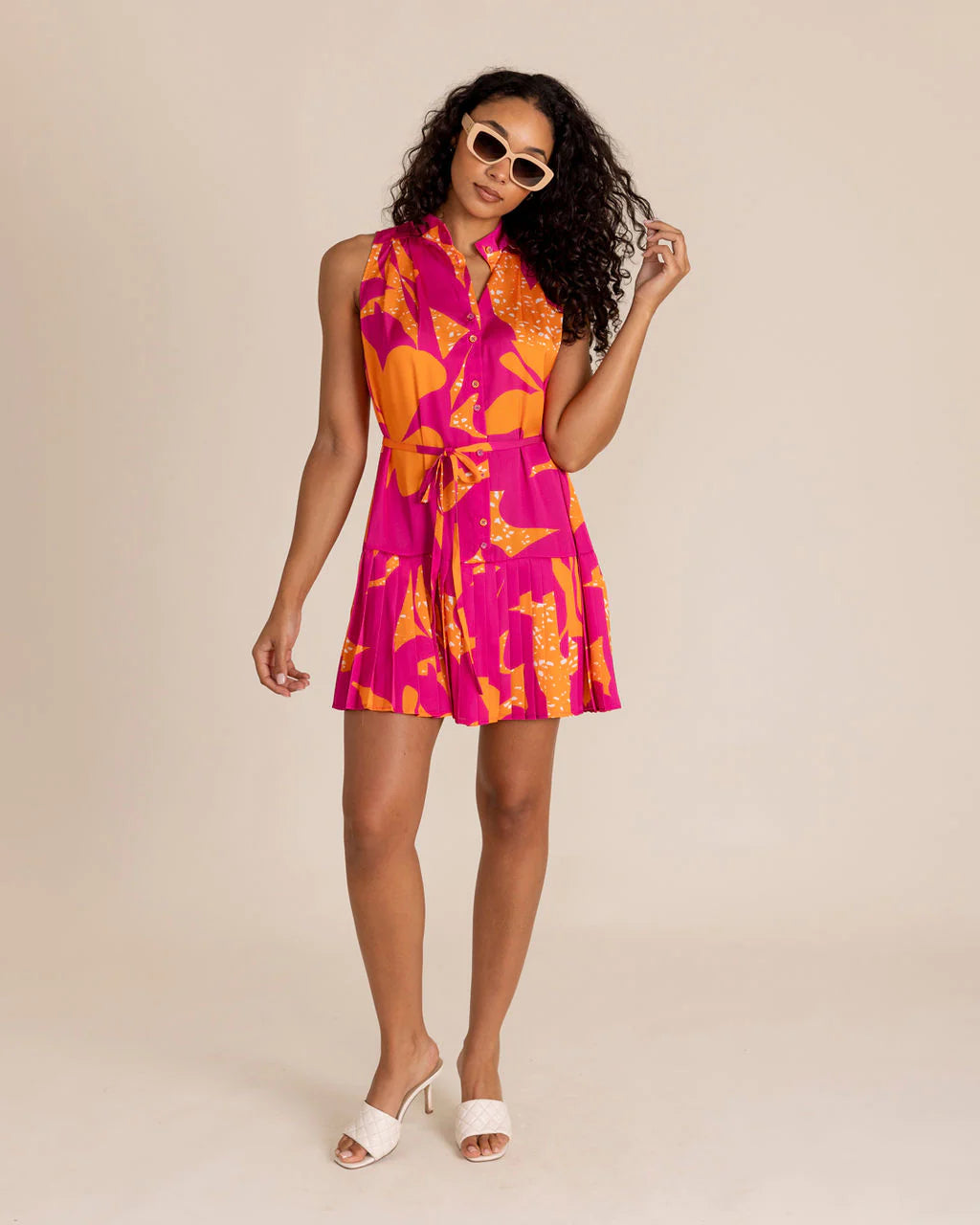 Show off your flair for style in our Bella dress! The Bella dress is a sleeveless update on everyone's favorite Reagen. Bella is a mini dress featuring buttons down the bodice of the dress, a flirty pleated skirt and a matching belt.