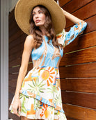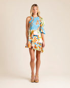 The Brooke dress features a one shoulder sleeve, asymmetric skirt, and its multi color print is sure to make a statement! The smocked bodice offers extra stretch and provides overall comfort.