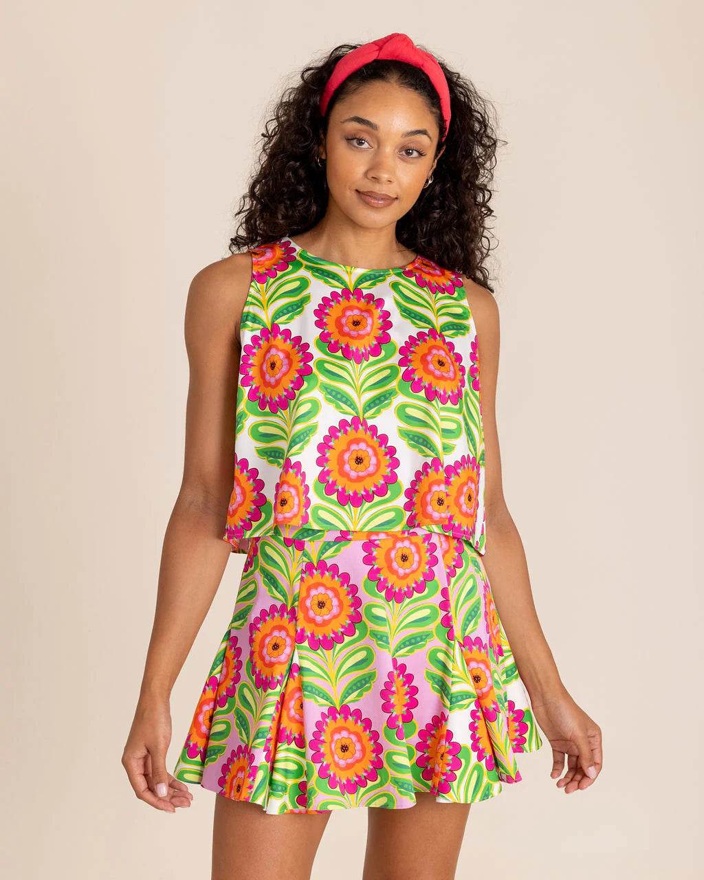 Welcome all the warm weather in our New Nicole tank! The Nicole is a new cropped tank featuring a zipper detail in the back. Pair with white jeans or our new Paris skort for a perfect Spring look.