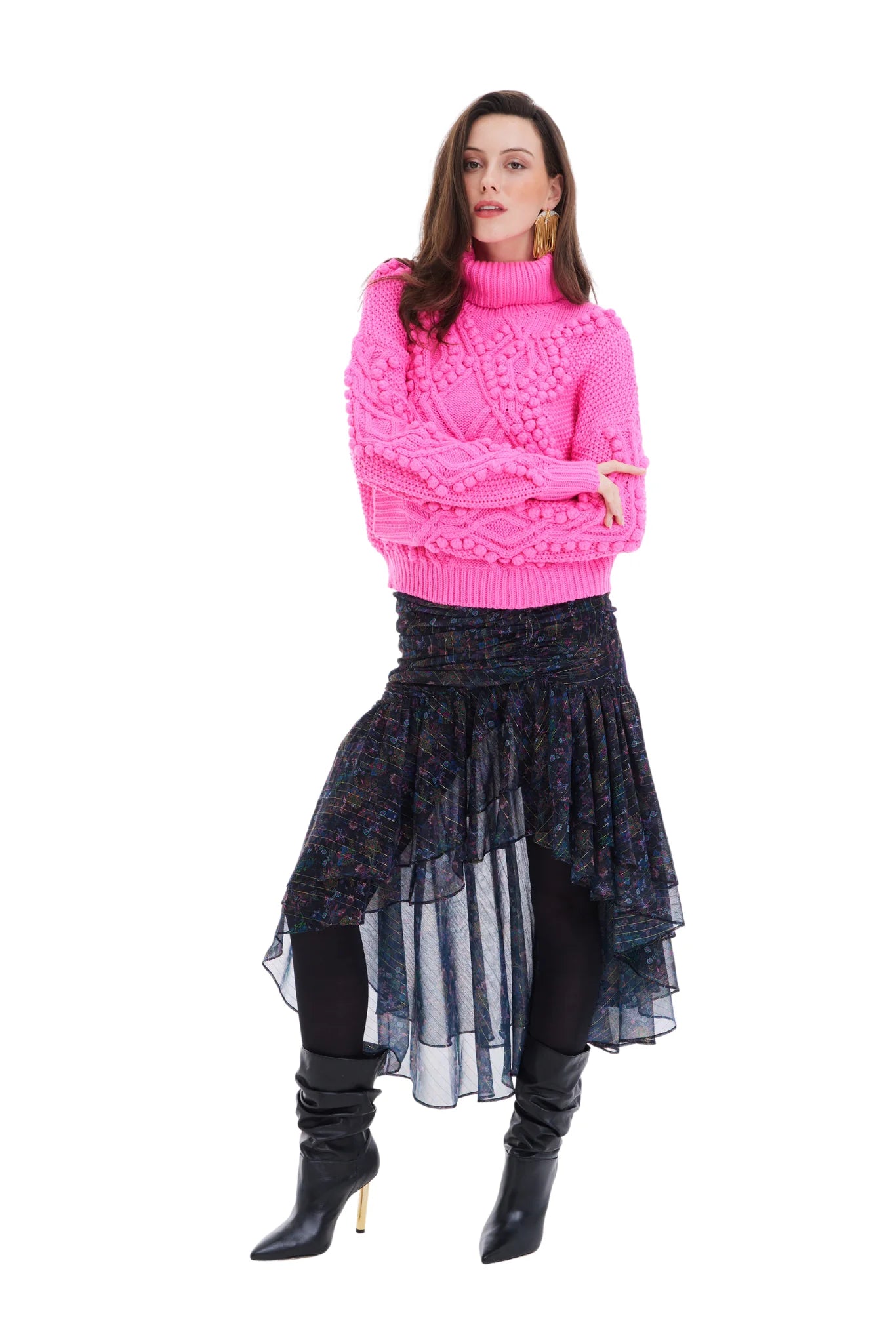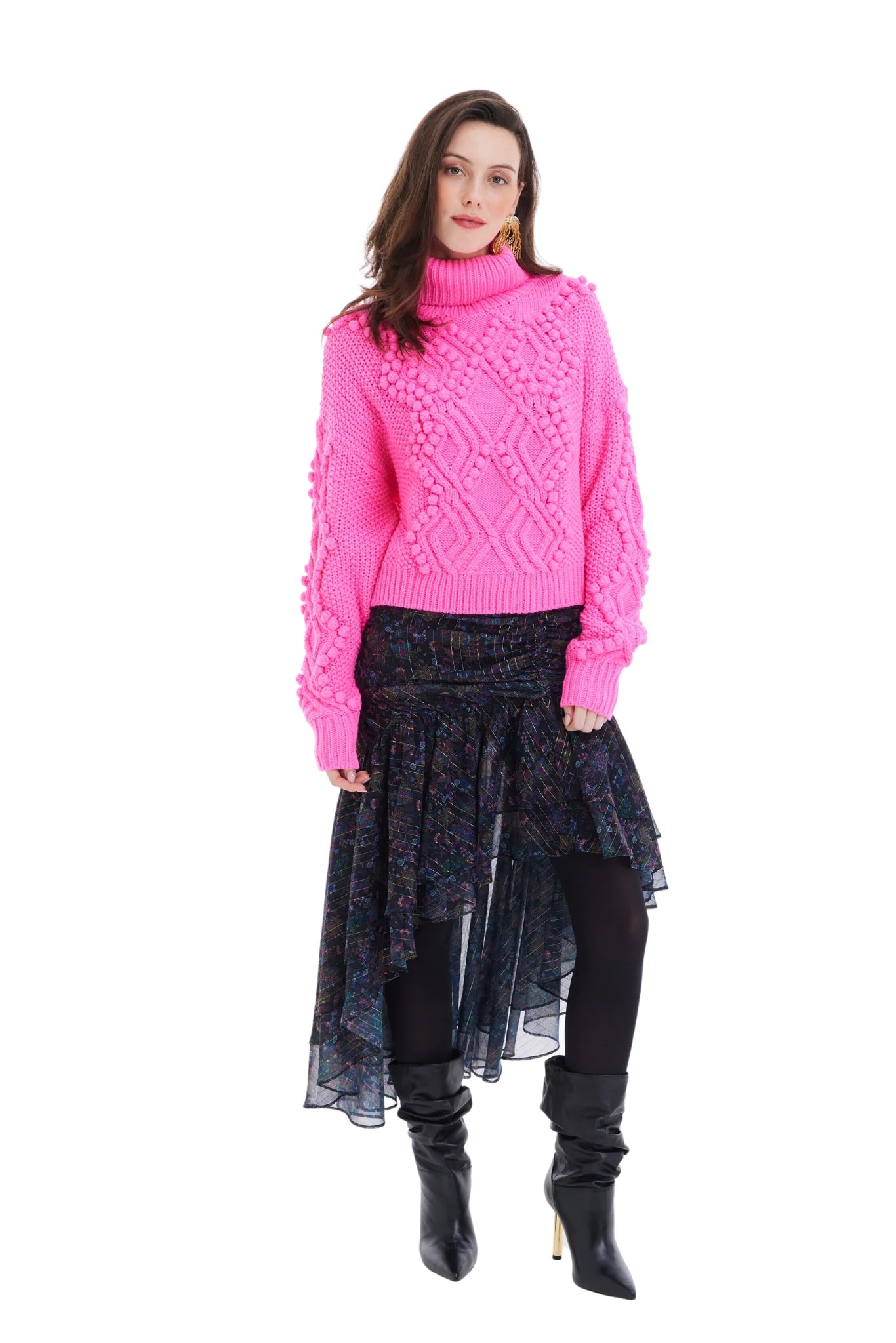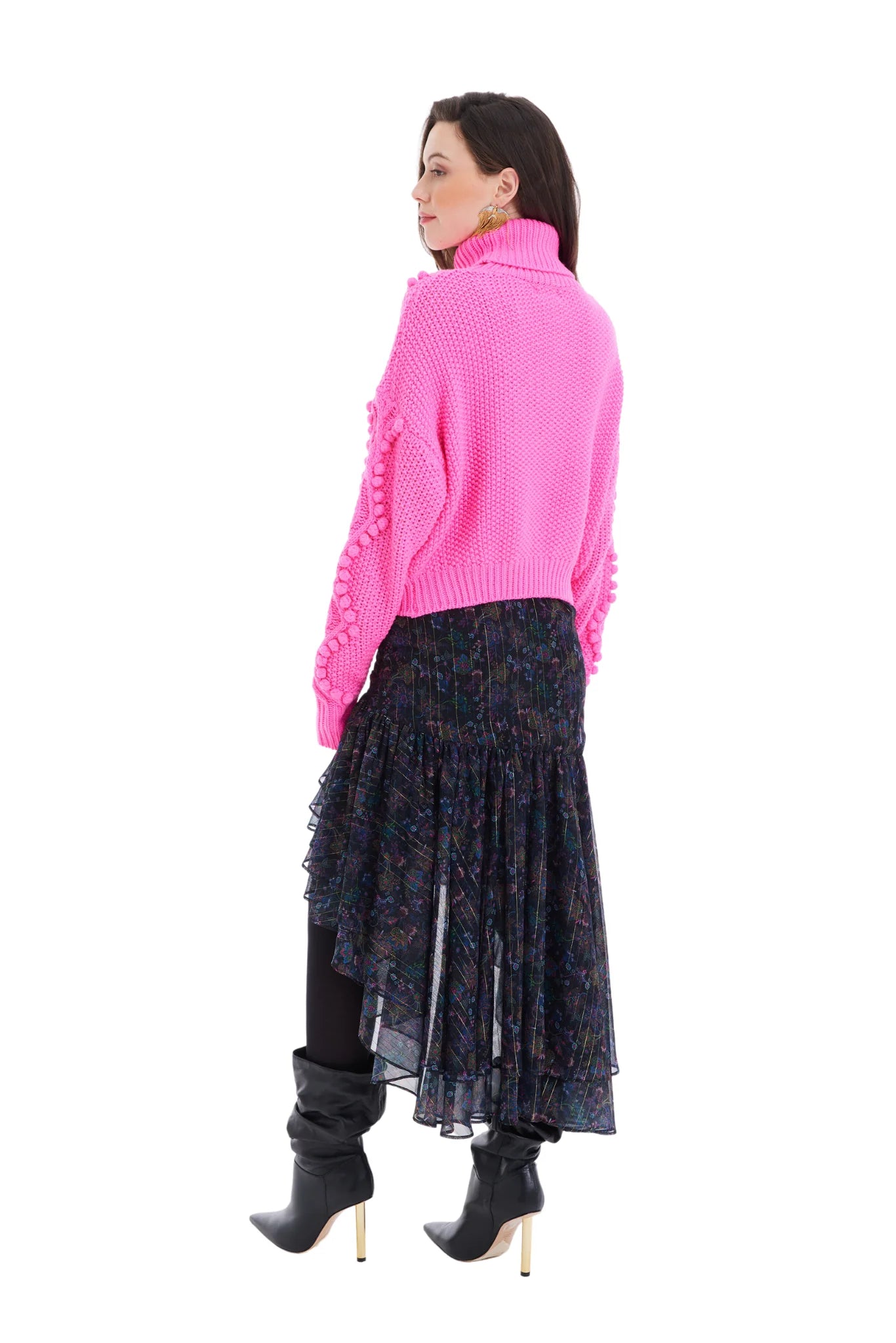 The DAPHNE SWEATER in Hot Pink features playful hand-stitched pom poms and a relaxed fit for a stylish yet cozy look. Its high-quality construction ensures you'll enjoy this sweater for years to come.