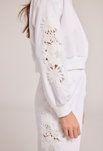 Give your streetwear style a romantic touch with the Arabella. Design with unlined, soft cotton terry, this lightweight sweatshirt features a wide elastic waistband and gorgeous sheer floral appliques on the sleeves. Perfect for those days when you want to be comfortable yet chic. Complete your look with your favorite sneakers and jeans or joggers.