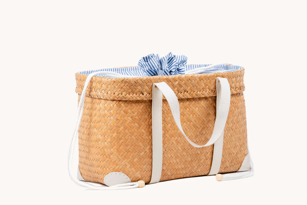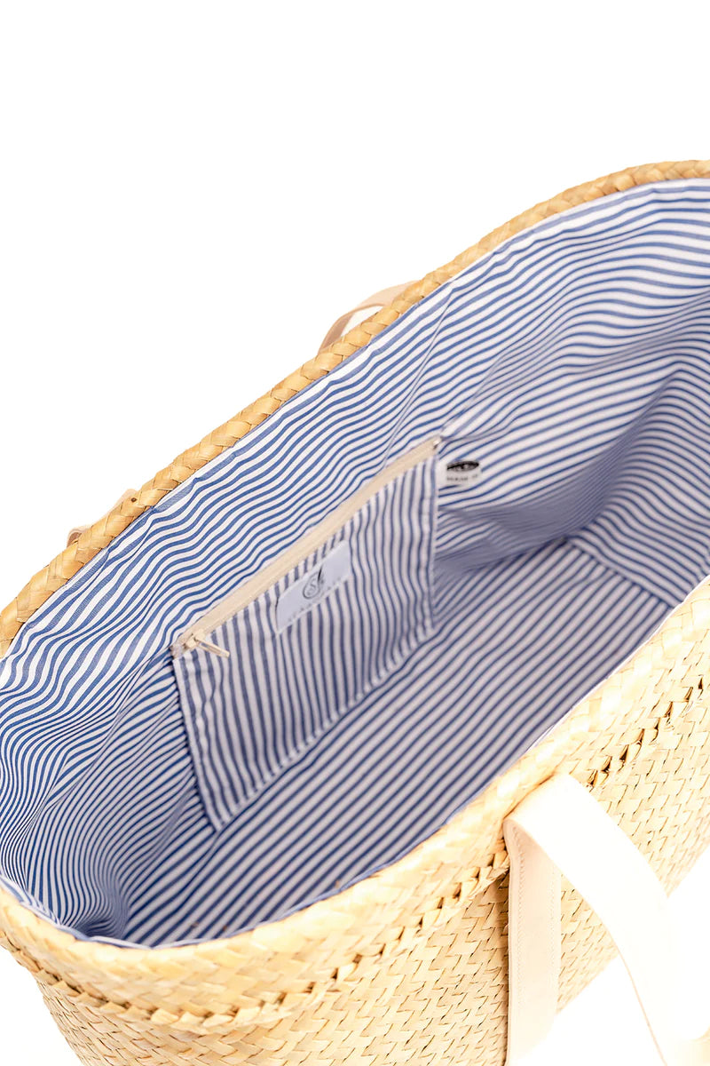 Kayla Carryall bag features a drawstring basket made from pliable sedge seagrass. The gorgeous handbag has a blue and white inner lining and inside pocket. Sedge seagrass is soft, flexible, and durable.