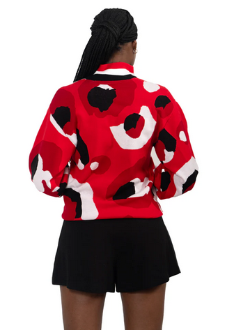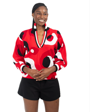 The Lolli Sweater in Red Collegiate Cheetah combines style and comfort. The lightweight knit features a stand collar and fretwork neckline, with 3/4 blouson sleeves for a tailored fit. Perfect for game day, pair it with our Swing Short in Red Varsity Ombre for a touch of bold contrast.