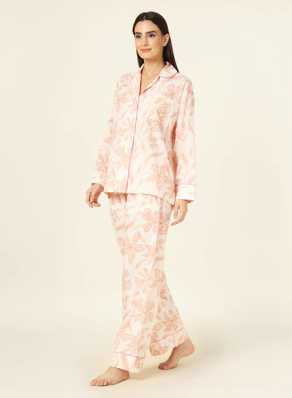 Bedtime is more beautiful with this gorgeous pajama set, featuring a button-down long-sleeved top and full-length pants with a drawstring waist. With a lovely bold print, this set will be in your regular sleep rotation for years to come.