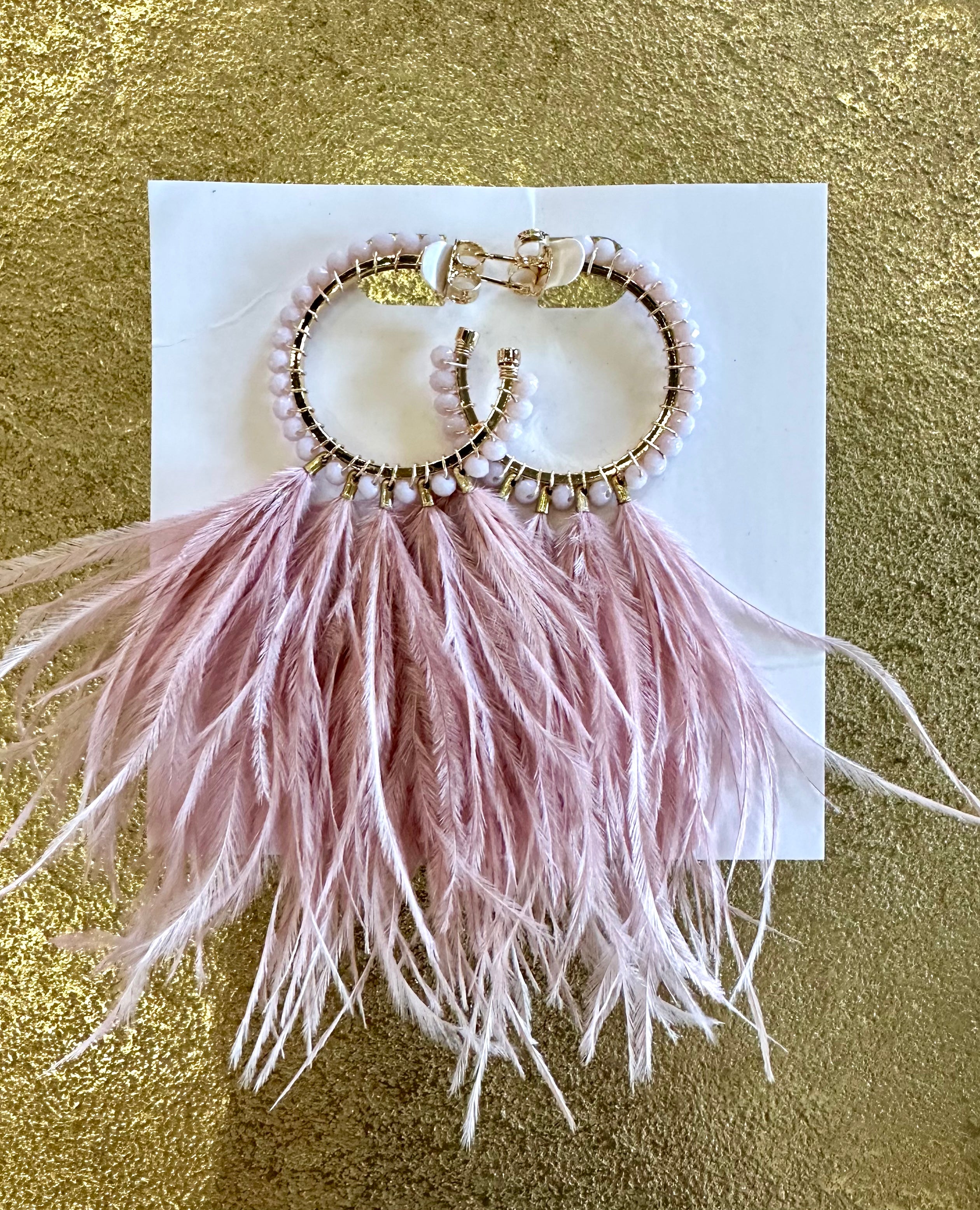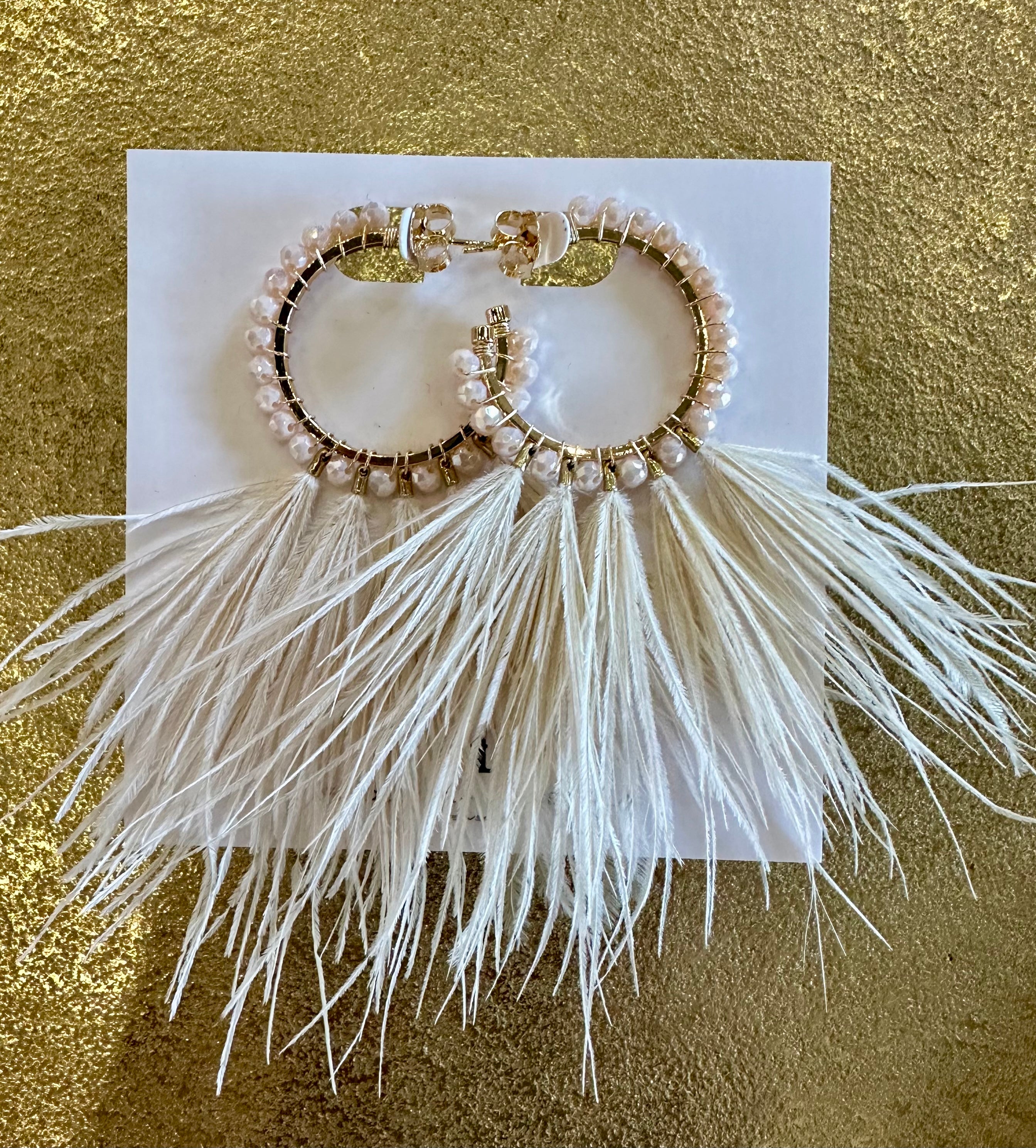 24K GOLD PLATED HANDCRAFTED HOOPS WITH JADE FACETED BEADS AND DELICATE OSTRICH FEATHER TASSELS