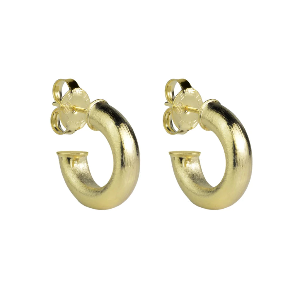 Handmade in Brazil. You asked, we listened. This Thinner version of our Small Chantal Hoops will be one of your Sheila Fav's. This one is the "itty bitty" version that is easy to wear with everything and Hand Brushed to emit a beautiful glow! A definite must for your collection!